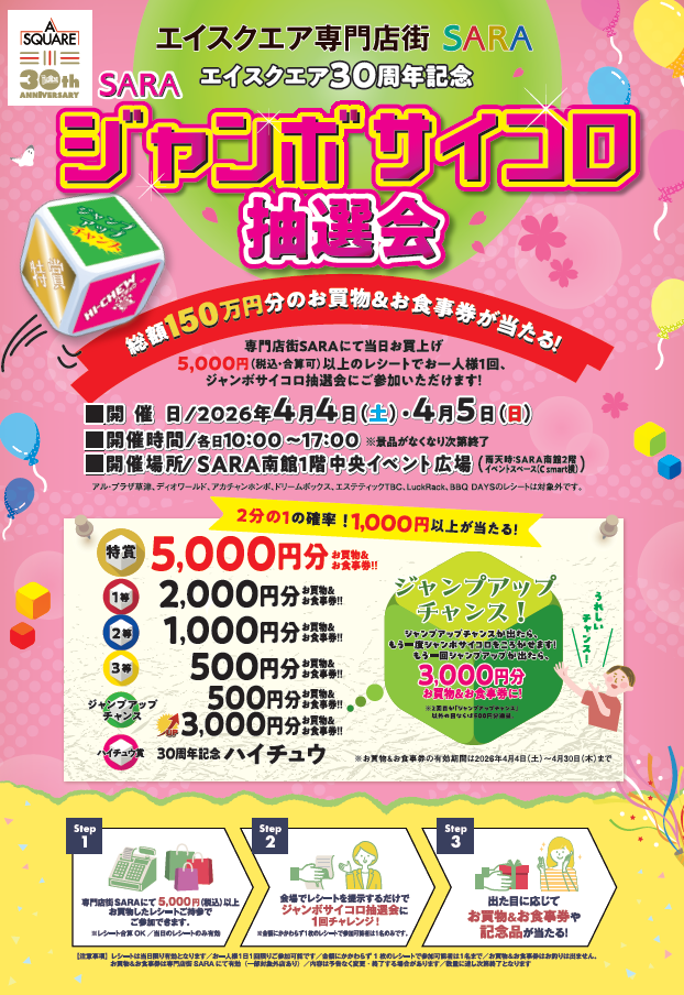 専門店街SARAにて、お買い上げ5,000円(税込・合算可)以上のレシートでお一人様1回、ジャンボサイコロ抽選会にご参加いただけます!