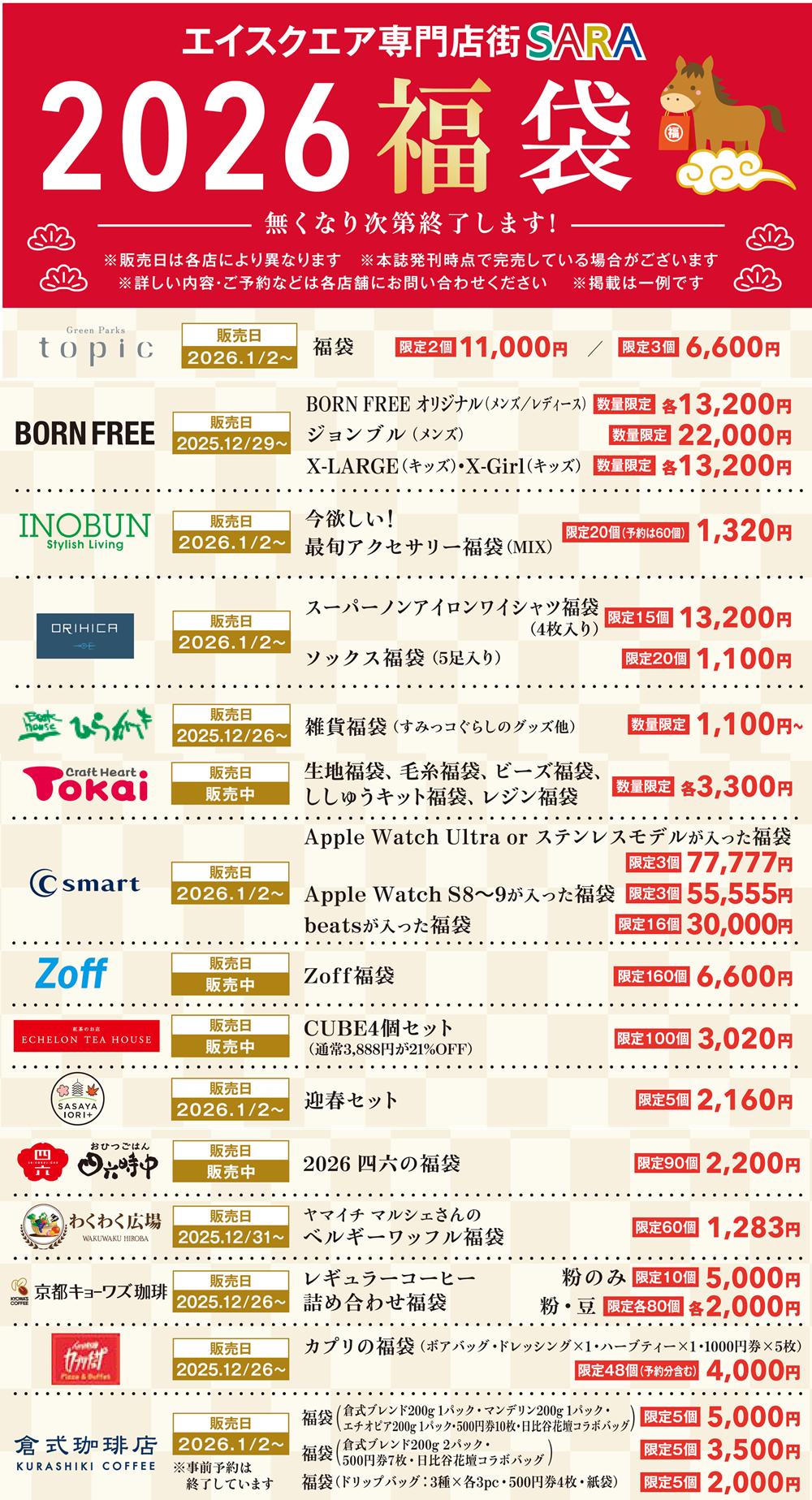 人気ショップの福袋が勢ぞろい! 数量限定・早い者勝ちの特別アイテムをお見逃しなく。 今年だけの“とっておき”を手に入れて、ハッピーな一年のスタートを♪