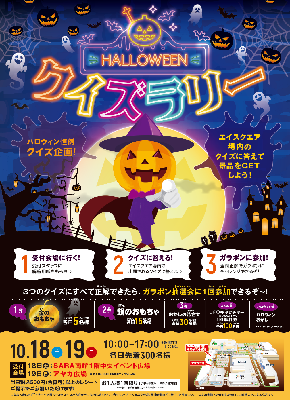 エイスクエア場内を巡ってクイズに挑戦! 全問正解でご褒美のガラポンにチャレンジ!! ※参加方法:500円以上のレシート提示で1名様参加 ※小学生以下のお子様対象 ※各日300名様
