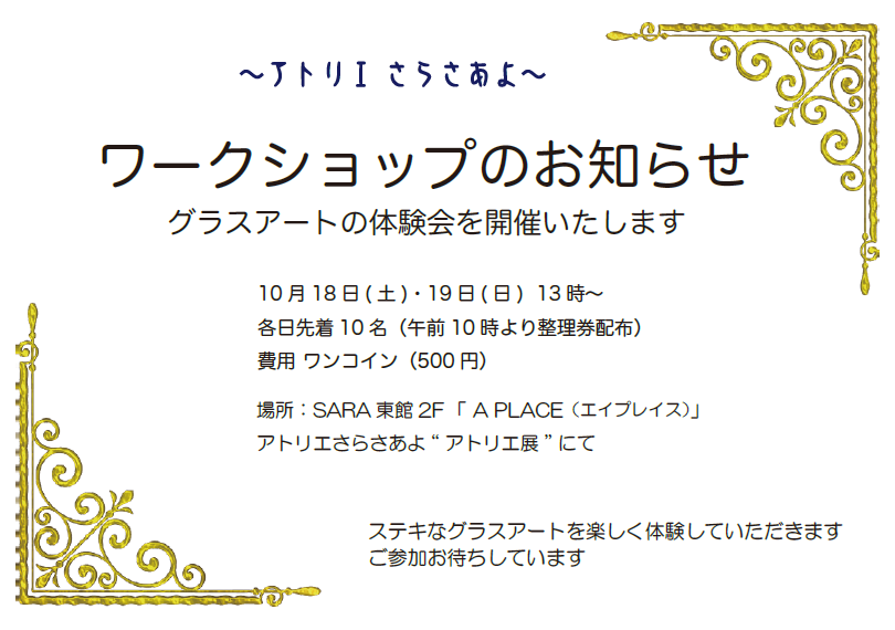 手作り大好き仲間が集まって、ワイワイ楽しく作品を作っています。 色選びにワクワクしながら…!できた作品を思い描きながら…! 素敵な時間を過ごしています。 グラスアートやシルエットアートなど、ぜひ私たちの作品を見に来てください♪
