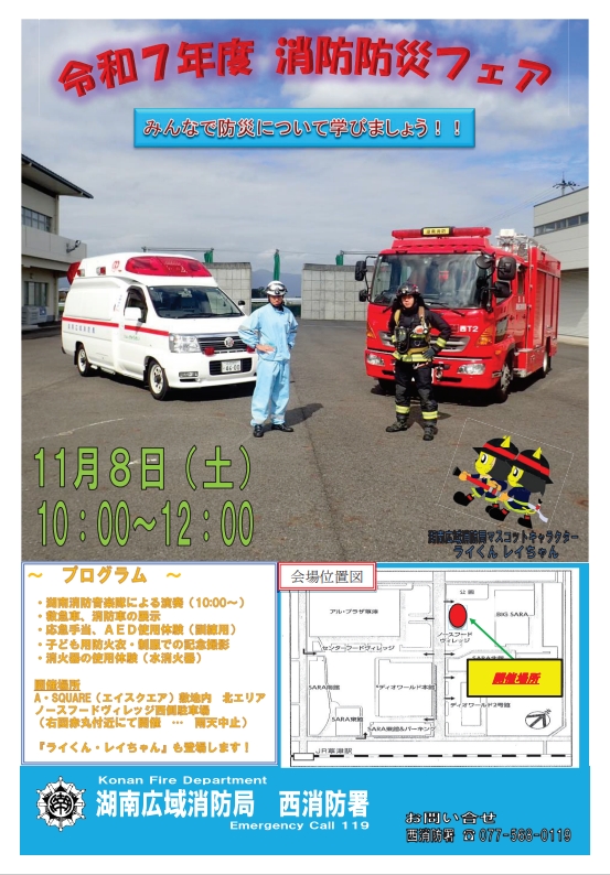 消防車・救急車がやってくる! ~消防防災フェア~開催!! ○湖南消防音楽隊による演奏(10:00~) ○消防車・救急車の展示 ○応急手当、AED使用体験(訓練用) ○子ども用防火衣・制服での記念撮影 ○消火器の使用体験(水消火器) ライくん・レイちゃんも来るよ!