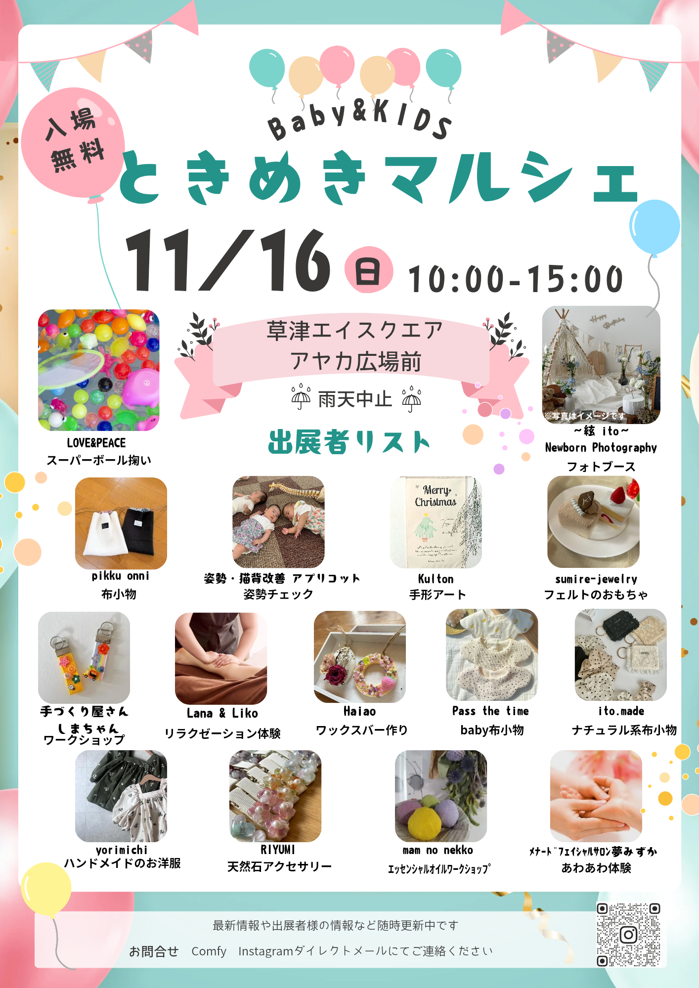 小物やアクセサリーなどのハンドメイド商品が盛りだくさん! 赤ちゃんやお子さま向けのグッズ、ワークショップもございます♪ 皆さまのお越しをお待ちしております!! ※入場無料 ※雨天中止
