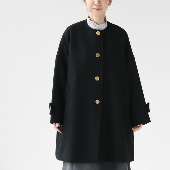 ノーカラーコートはハイネックやパーカーのフードを出して合わせたりしてもすっきりと見せてくれます。