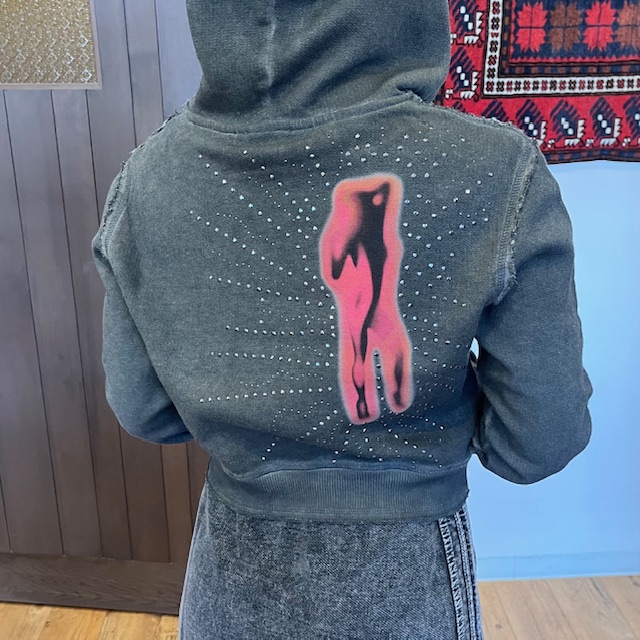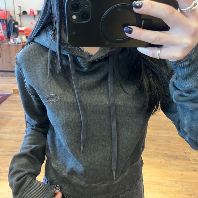 DIESEL F-Silmmy-Hood-S3 デニムを思わせるダメージディテールが印象的な プルオーバーパーカーが登場! 胸元のロゴとバックプリントにスタッズを あしらったスタイリッシュなアイテムです◎ Sサイズのみの入荷です! 是非、店舗にてご覧ください♪