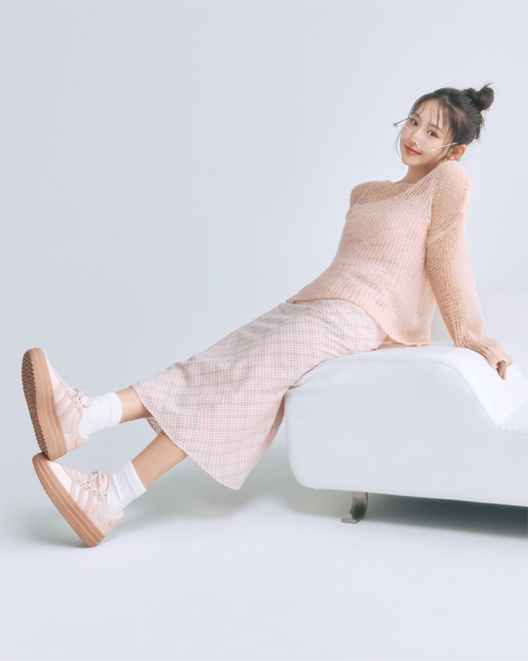 テキスタイル×レザーのアッパーが特徴のスニーカーとふんわりニットの素材感のコントラストが、甘さに奥行きをプラス。