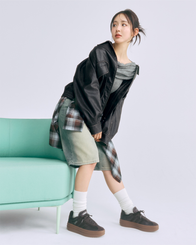 トレンドのブラウンを足元に取り入れ、ボリューム感のあるシルエットにさりげないこなれ感をプラス。